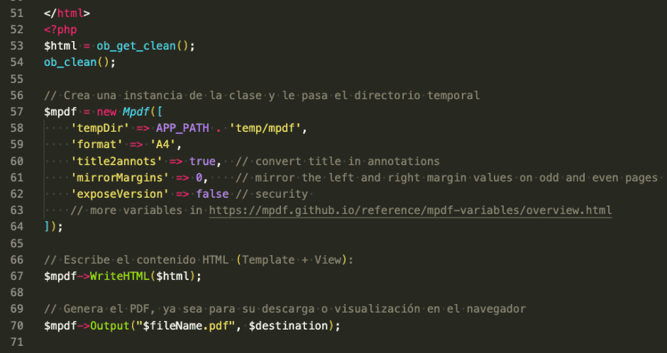 Y la parte final del template es la que se encarga de unir el template con la vista, generar el PDF con ese contenido y hacer que el documento se visualice o descargue.
